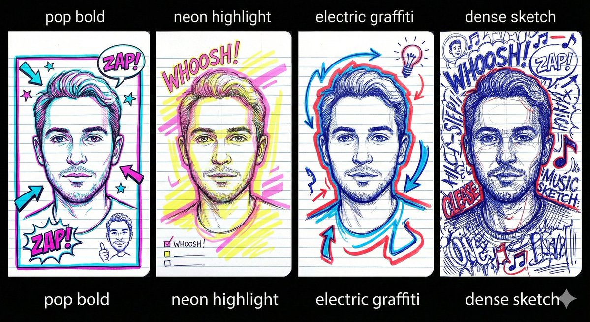 一个为 Gemini Nano Banana Pro 设计的图像生成提示,旨在创作一幅年轻男子的肖像。该肖像以高度细致、混乱的学生涂鸦素描风格呈现,绘制在带横线的笔记本纸上,使用各种彩色笔,并添加了手写笔记和霓虹外发光效果等元素。